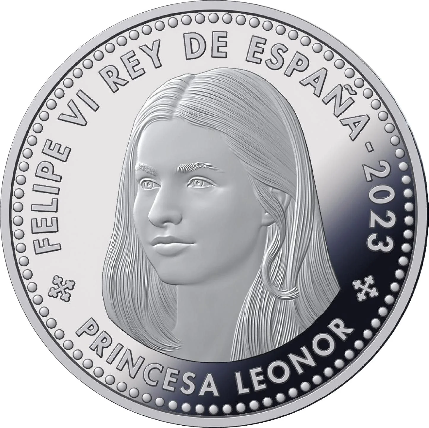 Princess of Asturias's colored coat of arms. Inside a circle, a quadruple latent image shows a schematized Victory Cross, the Mint mark, a royal crown, and the number 23.