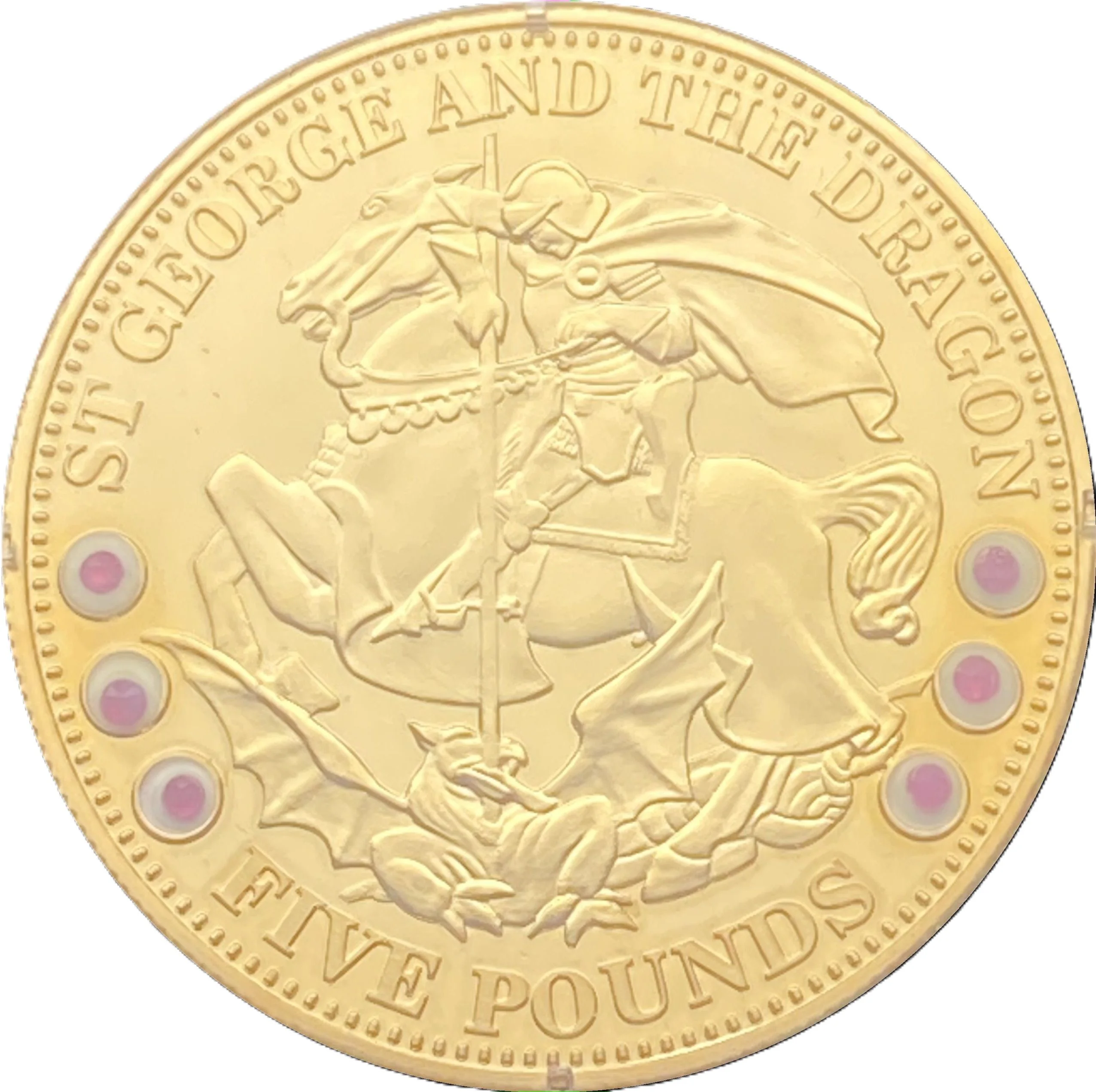 St. George slaying a dragon, inset with six rubies forming his cross.
