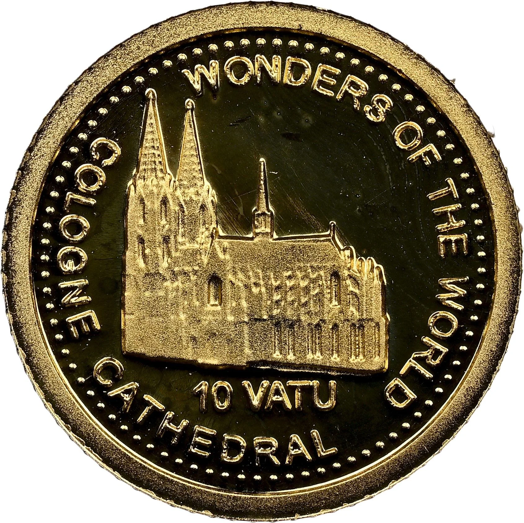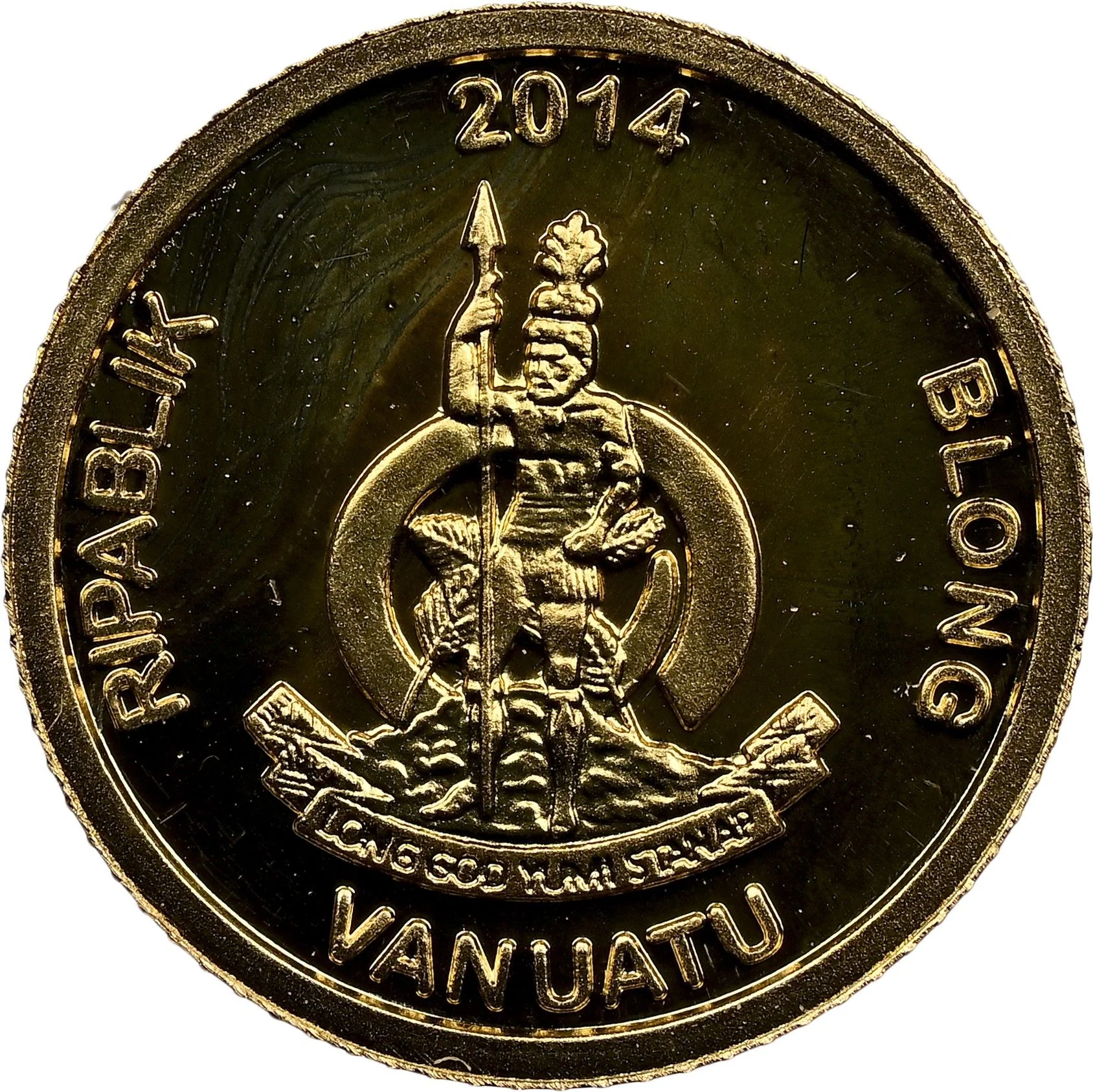 Vanuatu's arms show a Melanesian warrior before a curved boar's tooth, a scroll reading "LONG GOD YUMI STANAP," and the year.