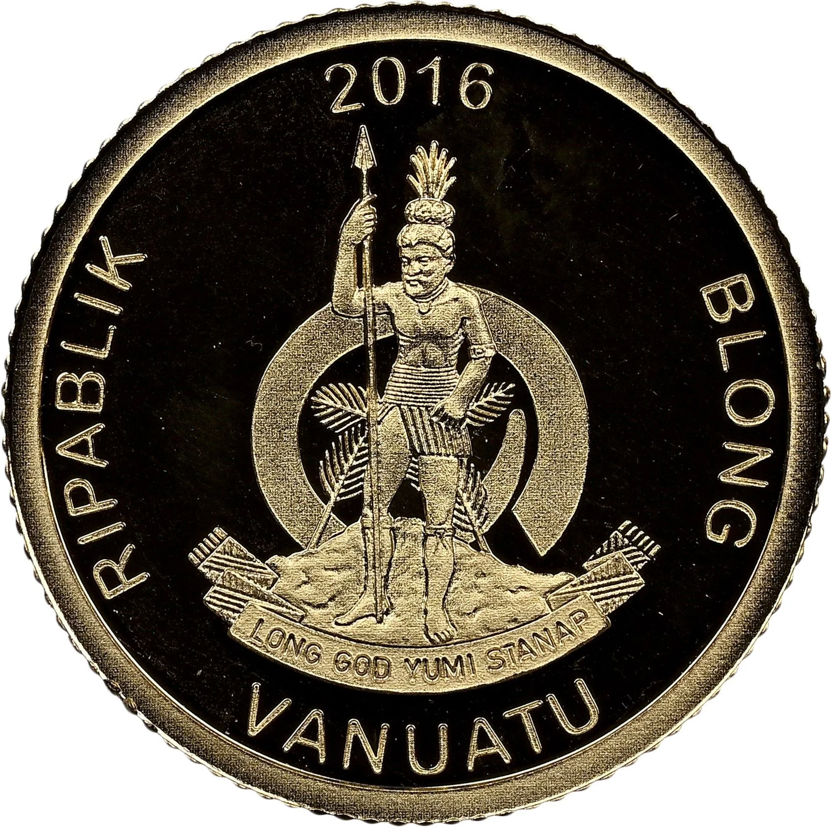 Vanuatu's arms depict a Melanesian warrior before a curved boar's tooth, a scroll reading "LONG GOD YUMI STANAP," and the date.