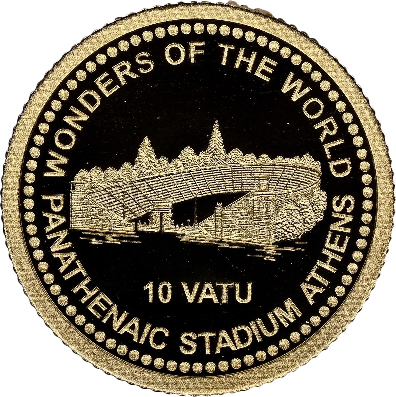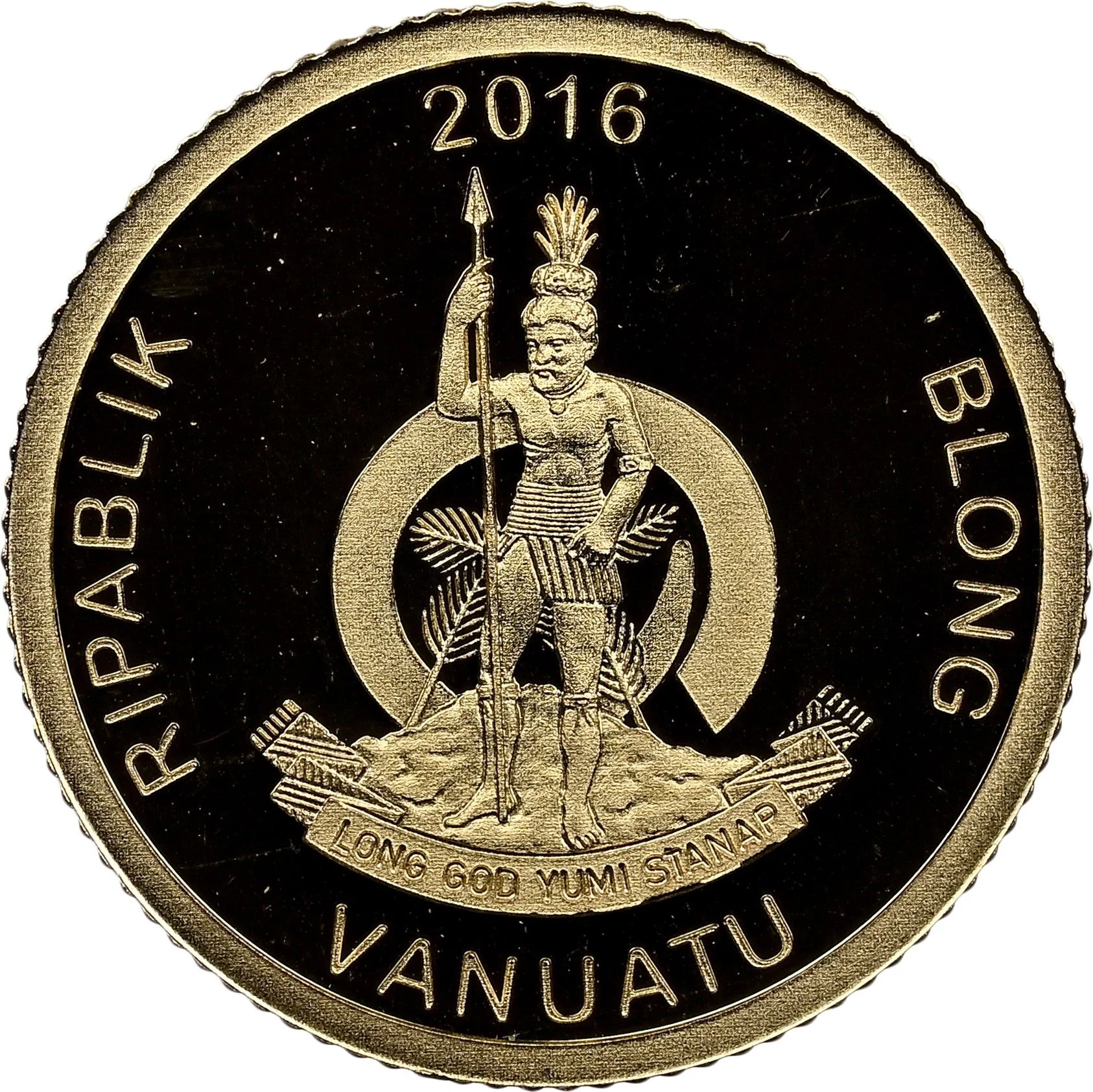 Vanuatu's arms depict a Melanesian warrior before a curved boar's tooth, a scroll reading "LONG GOD YUMI STANAP," and the date.