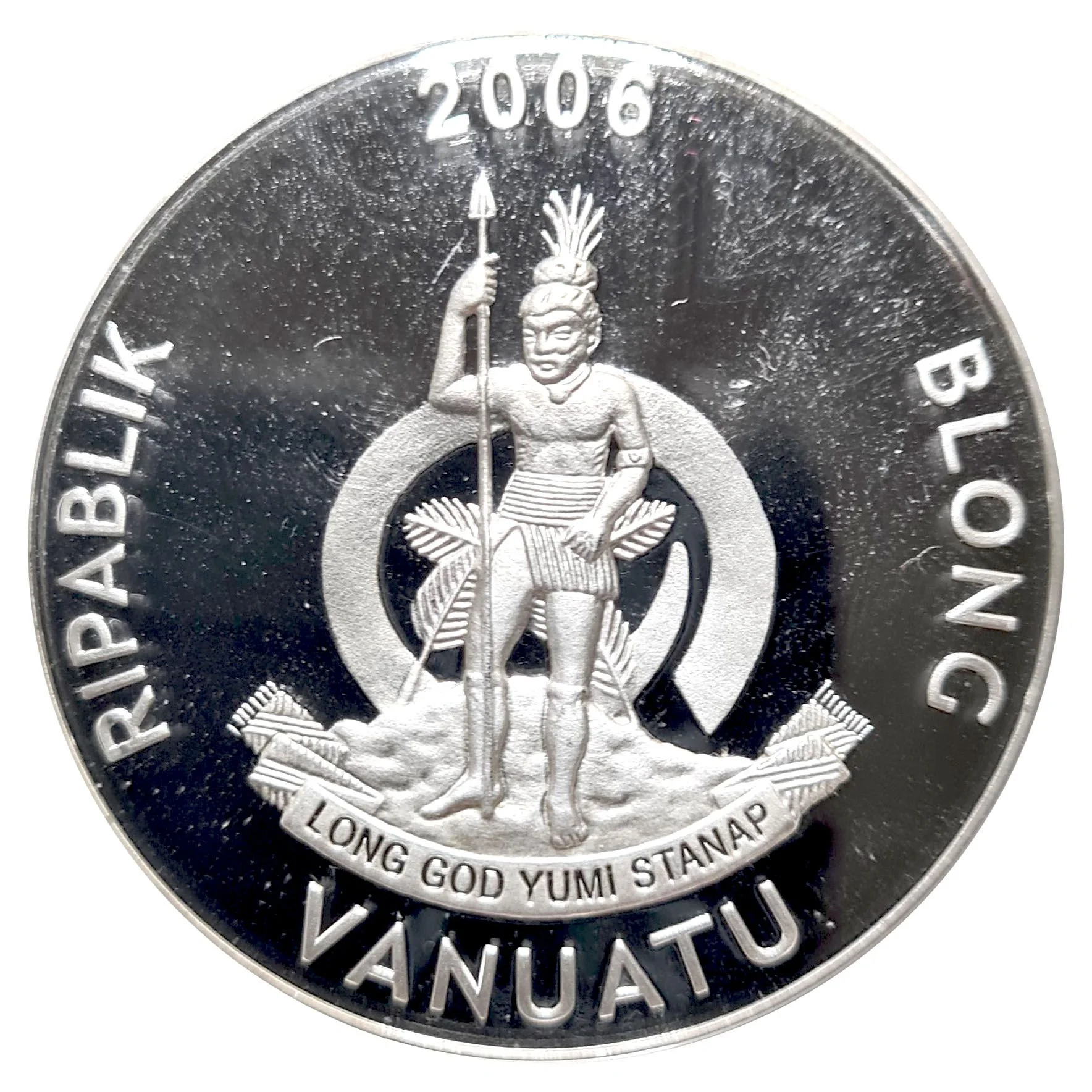 Vanuatu's arms depict a Melanesian warrior before a curved boar's tooth, a scroll reading "LONG GOD YUMI STANAP," and the date.