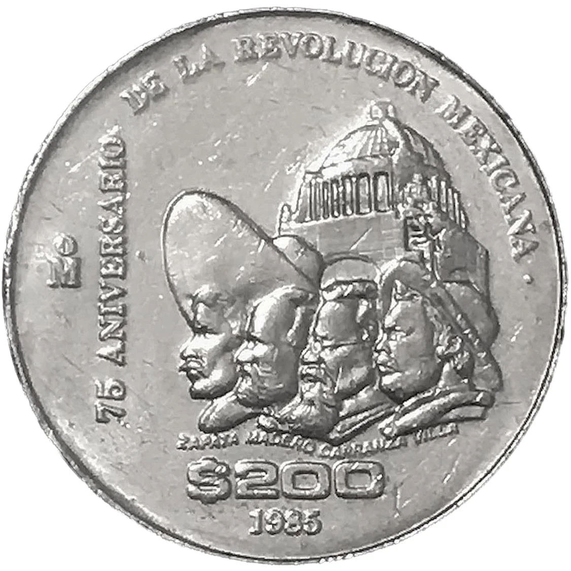 Left: "75 Aniversario De La Revolucion Mexicana" over left-facing busts of Zapata, Madero, Carranza, and Villa, with their names below. The Monument to the Revolution is in the background; value and date are at the bottom.