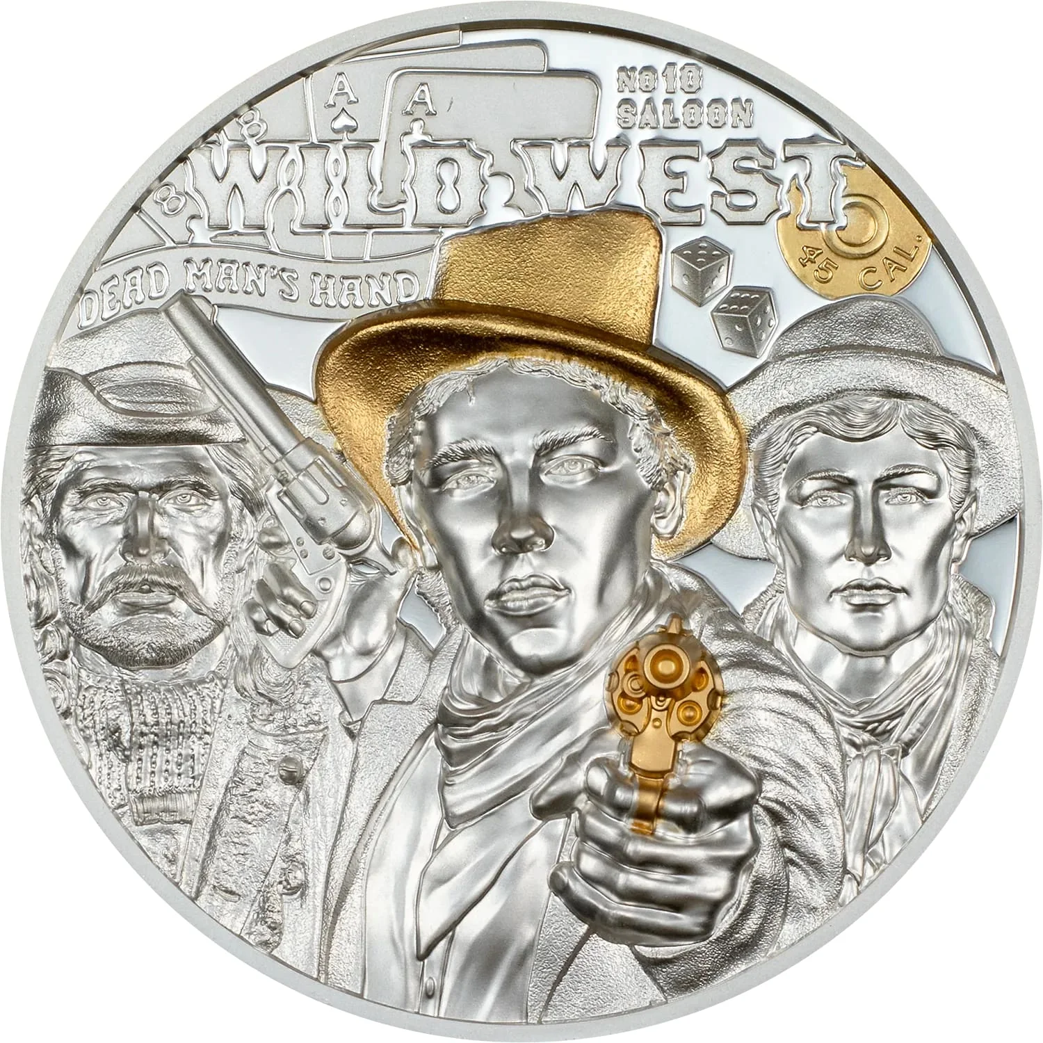 The saloon's name, Dead Man's Hand, and the fatal bullet are shown beside portraits of Billy the Kid, Wild Bill Hickok, and Calamity Jane.