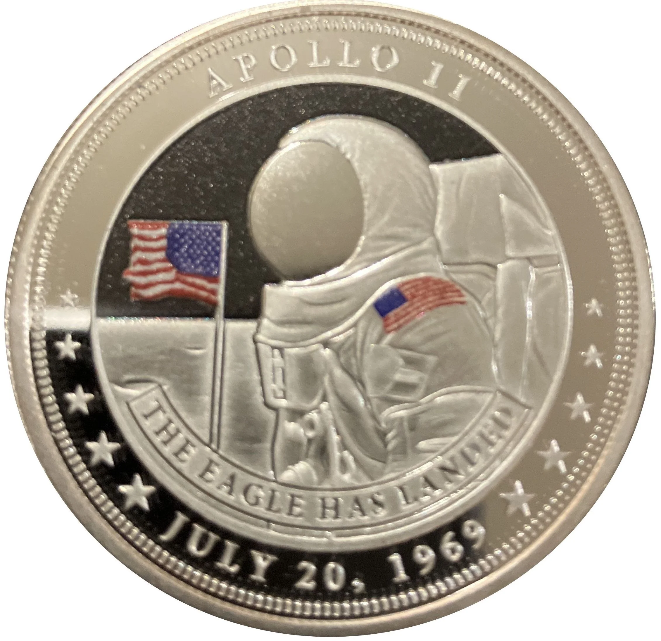 Astronaut on the Moon with the US flag. Banner reads "THE EAGLE HAS LANDED" and "July 20, 1969." Only the flag and shoulder patch are in color against the black space.