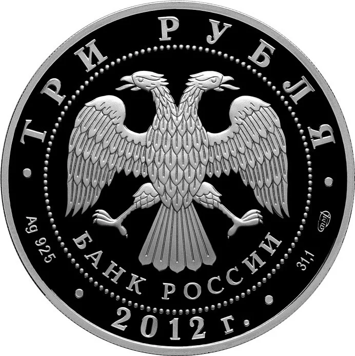 A two-headed eagle with lowered wings, the emblem of the Bank of Russia, above the semicircular inscription "БАНК РОССИИ". The design is framed by a beaded circle. The rim inscription, divided by dots, reads "ТРИ РУБЛЯ" and "2012", with metal fineness, the mint mark, and fine metal content between them.