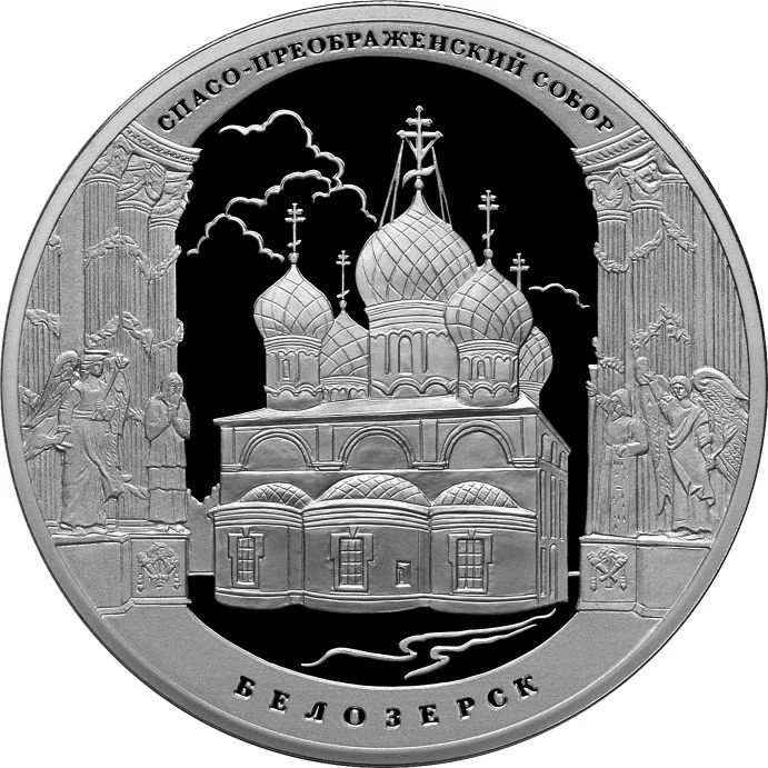 The reverse features the Saviour Transfiguration Cathedral in Belozersk, including an interior detail. Inscriptions read "СПАСО-ПРЕОБРАЖЕНСКИЙ СОБОР" above and "БЕЛОЗЕРСК" below.