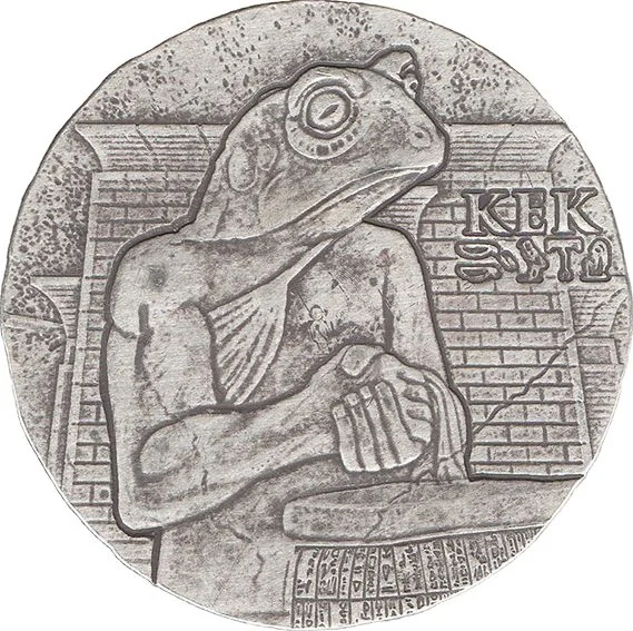 Statue of the frog god Kek before a building, with Latin and Egyptian names at right.