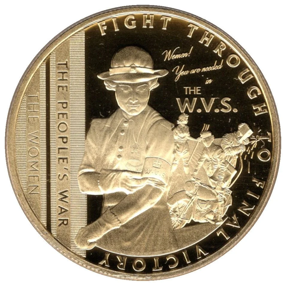 A woman in her Women’s Voluntary Service uniform, with a Post Woman, engineer, and Land Army woman in the background. "THE PEOPLE’S WAR" and "THE WOMEN" are inscribed on a Defence Medal ribbon.