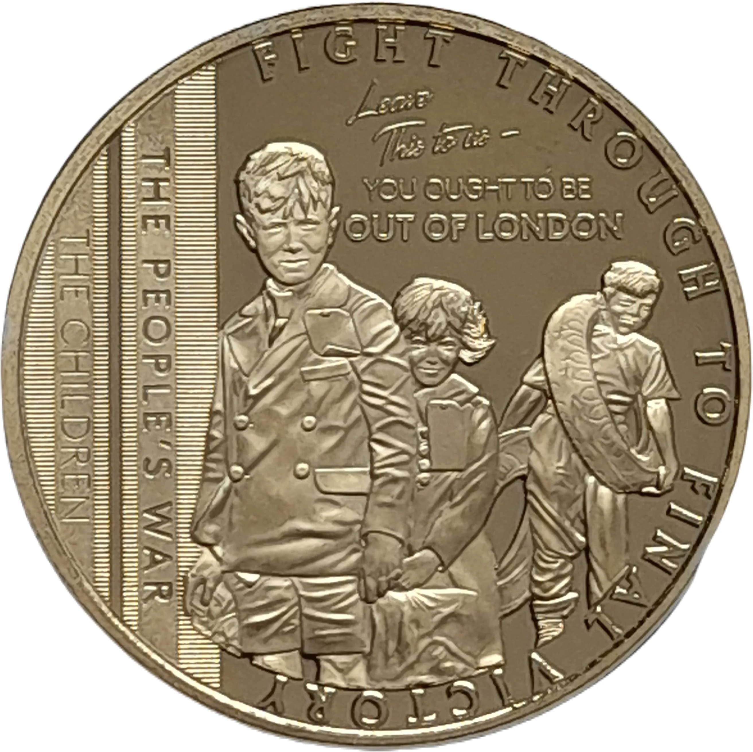 Two children wait with a suitcase and ID tags. Behind them, a boy represents child labor, with "THE PEOPLE'S WAR" and "THE CHILDREN" inscribed on a Defence Medal ribbon.
