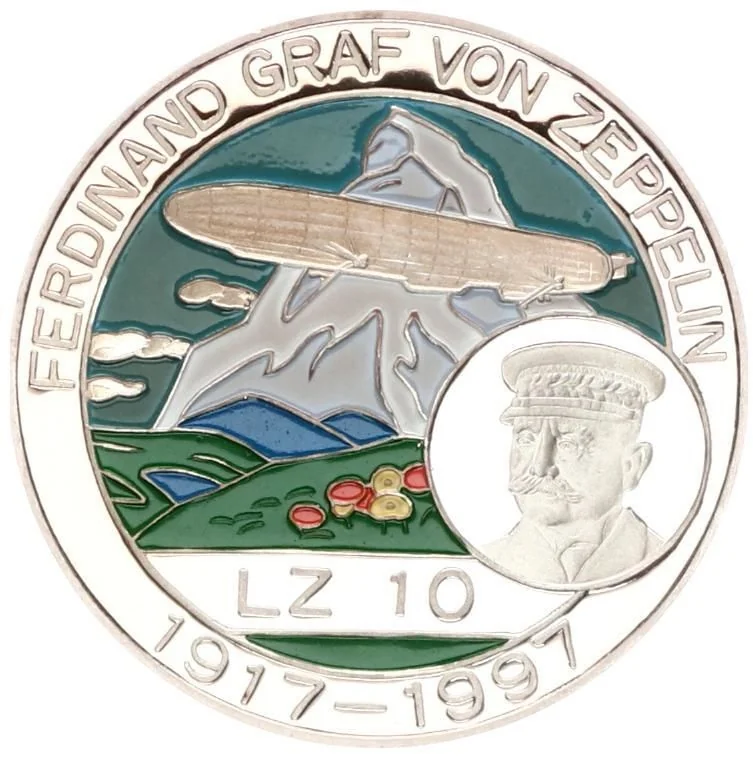 Ferdinand von Zeppelin portrait medallion over a mountain landscape.