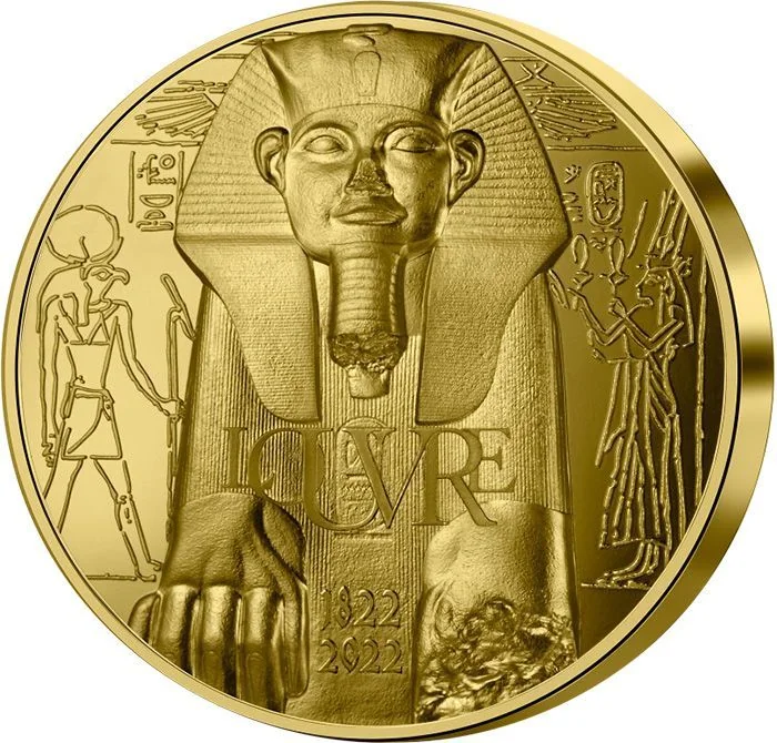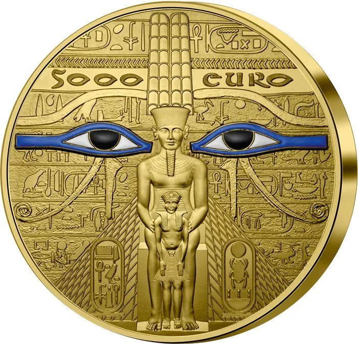 The reverse depicts the Divine Adorer Chépénoupet. A statue of Amun watches over Tutankhamun, whose cartouches appear on a pyramid below. The face value, "RF," and mintmark are at the center.