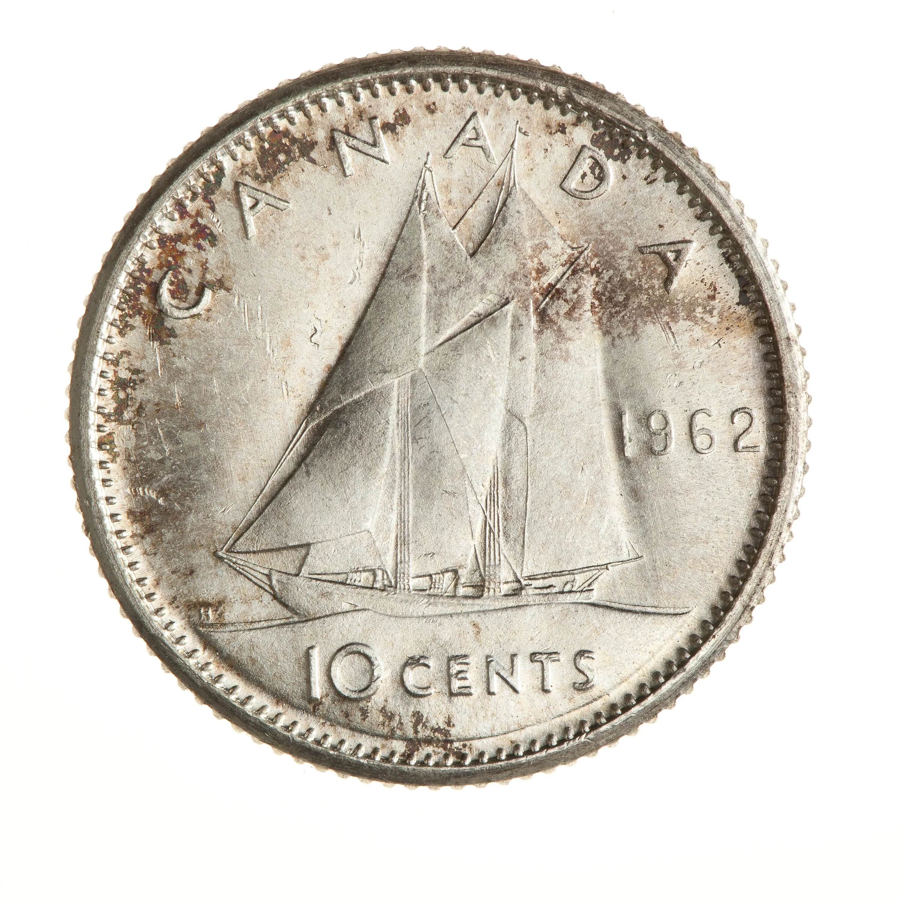 The Bluenose, a celebrated Nova Scotian racing schooner and provincial symbol, under sail with its face value and "CANADA."