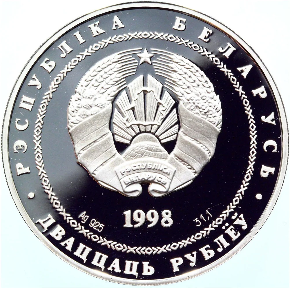 Description: The circular ornament features the relief State Coat of Arms. Below are the year, silver content, and alloy standard. The rim inscriptions read: "РЭСПУБЛIКА БЕЛАРУСЬ" above and "ДВАЦЦАЦЬ РУБЛЁЎ" below.