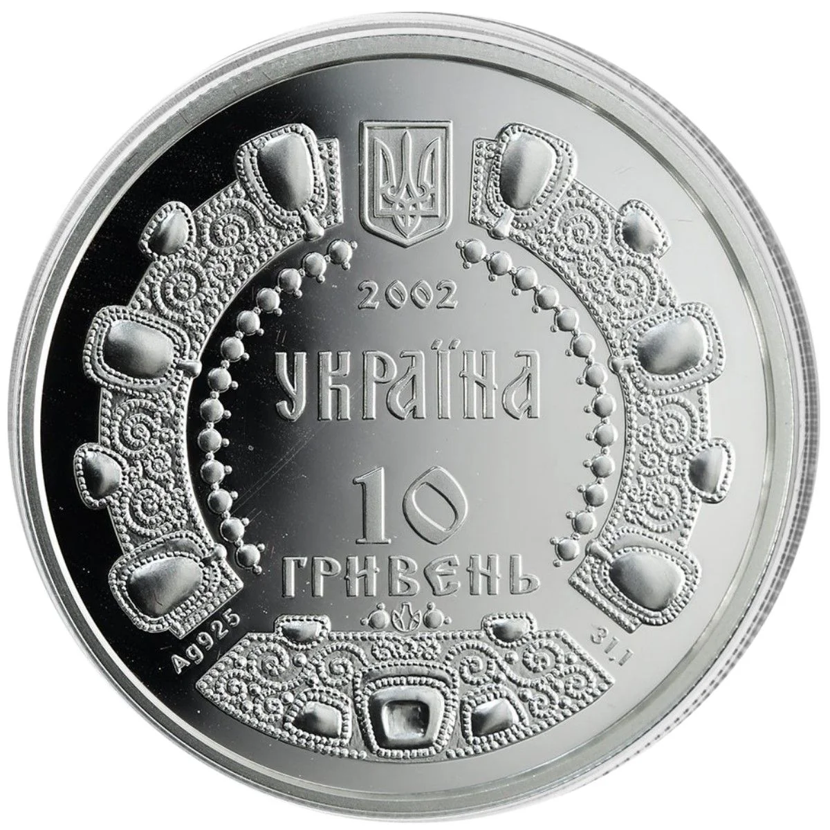 Set in a period manuscript design, the small National Emblem of Ukraine is engraved.