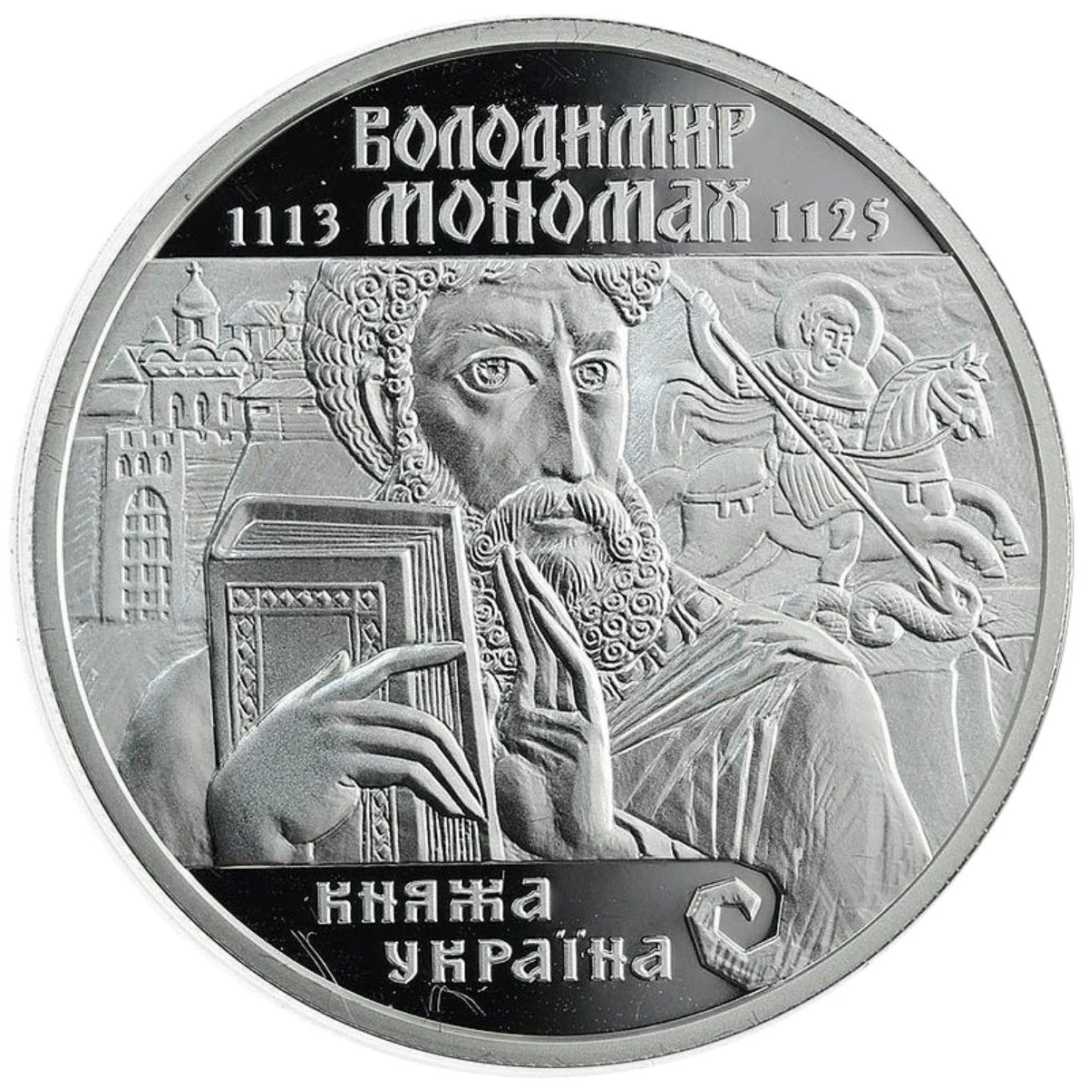 Against an Old Rus town backdrop, a half-length Prince holds a folio. To his right is Saint George fighting the dragon, with stylized inscriptions: "ВОЛОДИМИР 1113 МОНОМАХ 1125" above and "КНЯЖА УКРАЇНА" below.