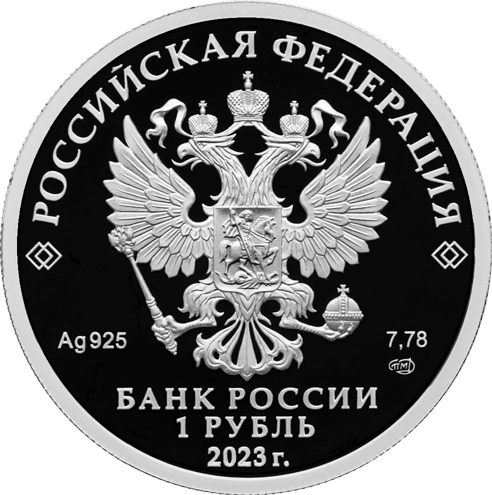 The disc's mirror field features a relief of the Russian Federation coat of arms. Above it, along the rim, is the semicircular inscription "РОССИЙСКАЯ ФЕДЕРАЦИЯ," flanked by doubled rhombuses. Below the coat of arms are markings for the metal fineness and the mint trademark. Centered at the bottom, in three lines, are the inscriptions "БАНК РОССИИ," "1 РУБЛЬ," and "2023 г."