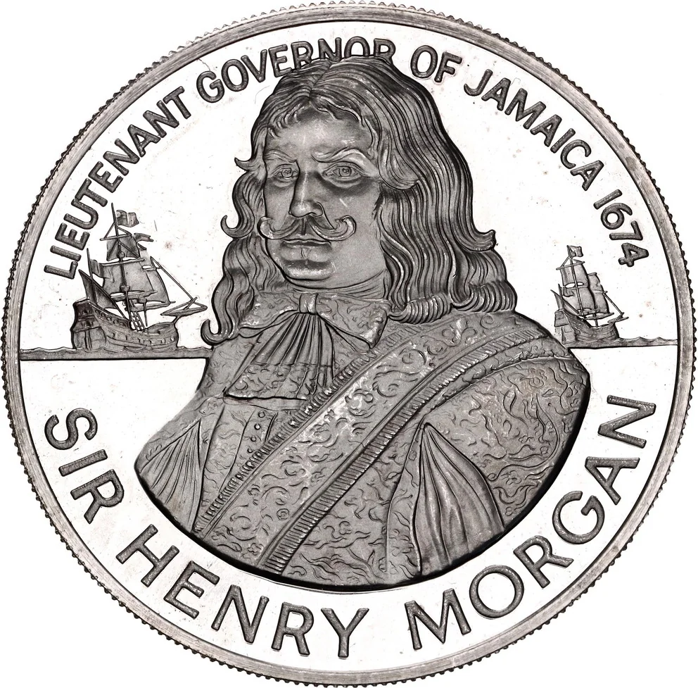Bust of Henry Morgan, ships flanking.