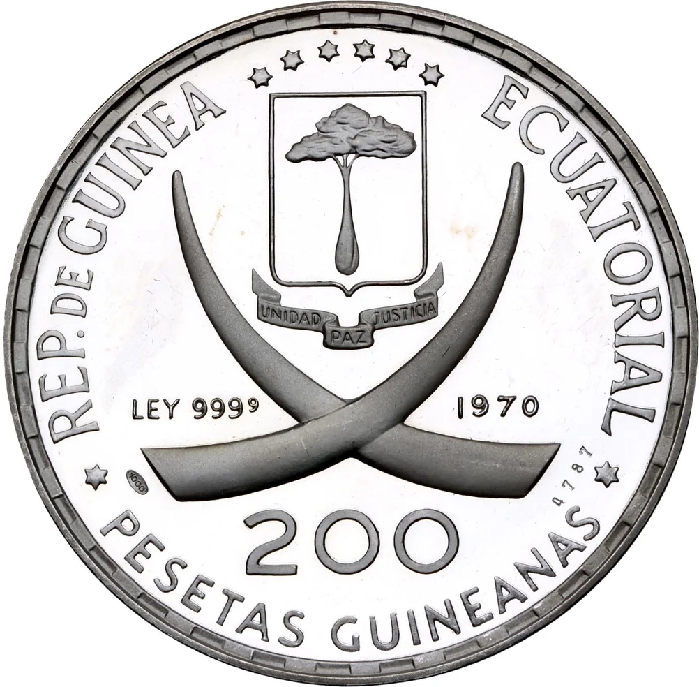 Description: Coat of arms of Equatorial Guinea above crossed elephant tusks.