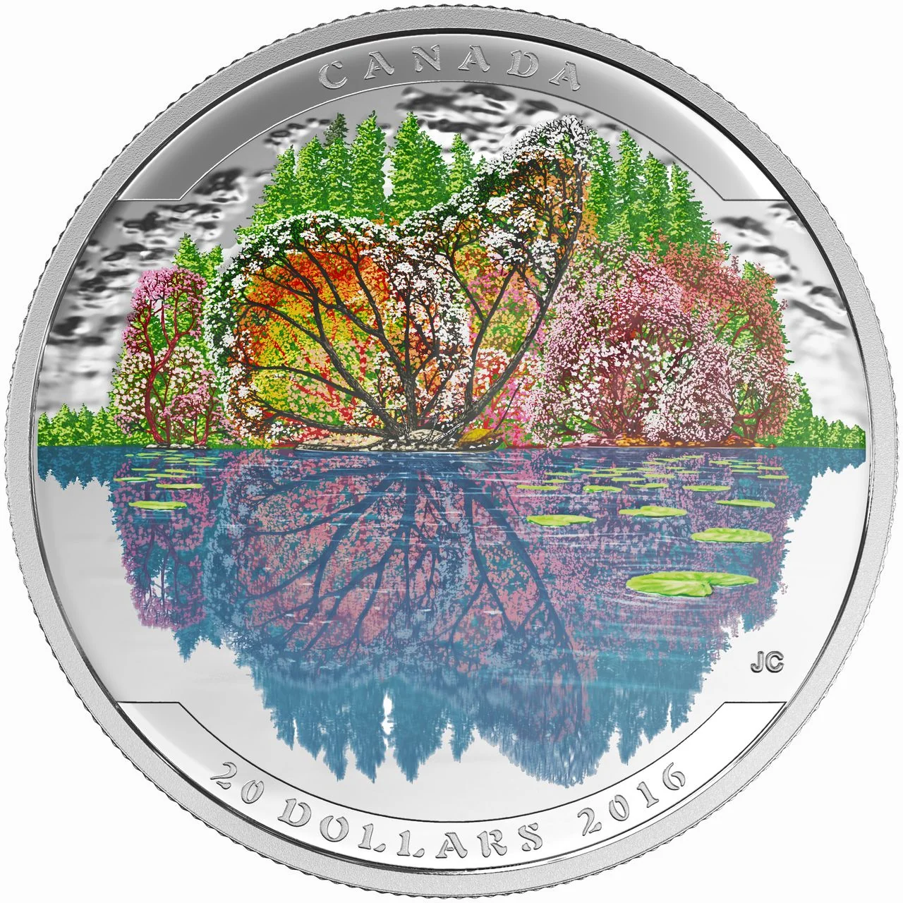 Colorful lakeside scene with butterfly-shaped trees.