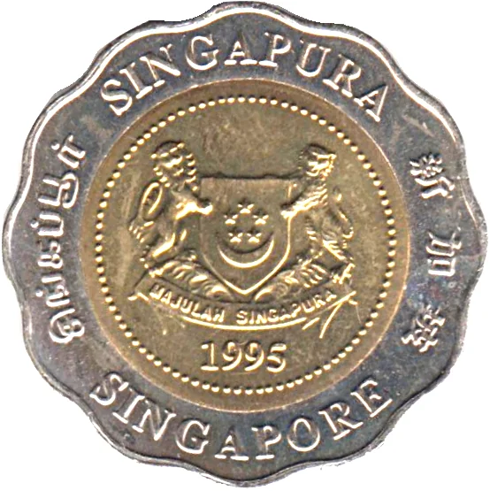 Emblem with date; 'Singapore' encircles it in English, Tamil, Chinese, and Malay.