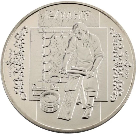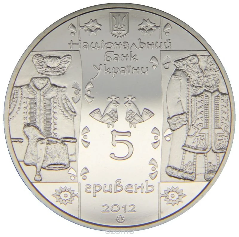 The obverse features the small Coat of Arms of Ukraine, the inscription "НАЦІОНАЛЬНИЙ БАНК УКРАЇНИ," and stylized depictions of two birds flanked by traditional Ukrainian clothing. Below are the denomination "5 ГРИВЕНЬ 2012" and the National Bank of Ukraine Mint logo.