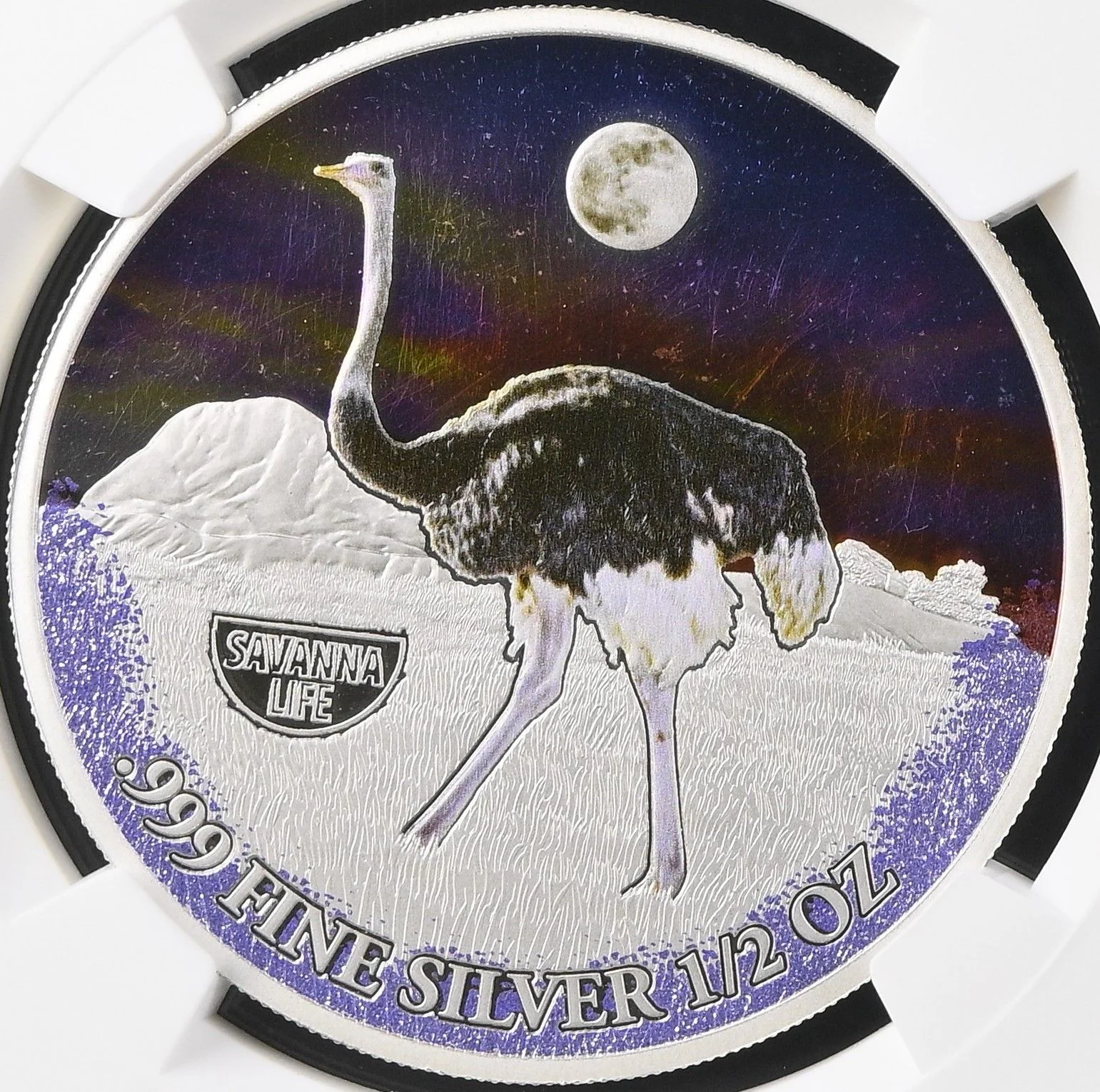 Ostrich walking left under moonlit hills.
