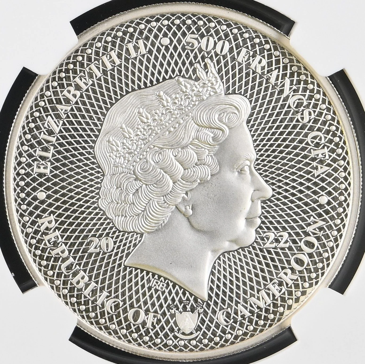 Queen Elizabeth II in profile, wearing the Girls of Great Britain and Ireland Tiara. Cameroon's coat of arms below.