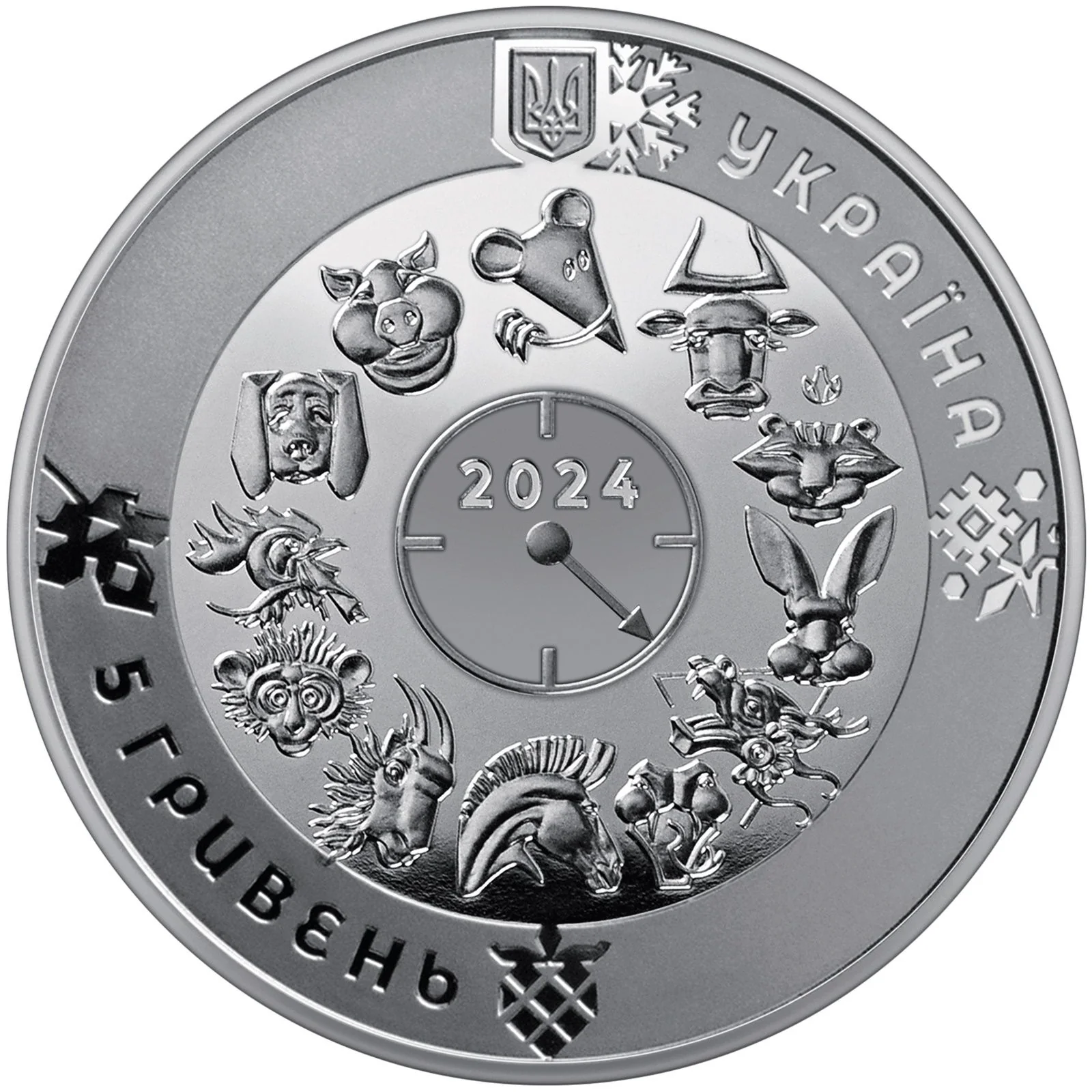 Ukrainian coat of arms and "УКРАЇНА" above. Twelve Eastern zodiac symbols encircle a mirrored center with a stylized clock; its hand points at the dragon for 2024. Below is "5 ГРИВЕНЬ." The matte background features vytynanka-style seasonal symbols: snowflake, flower, berry, leaf. The Mint logo is at top right.