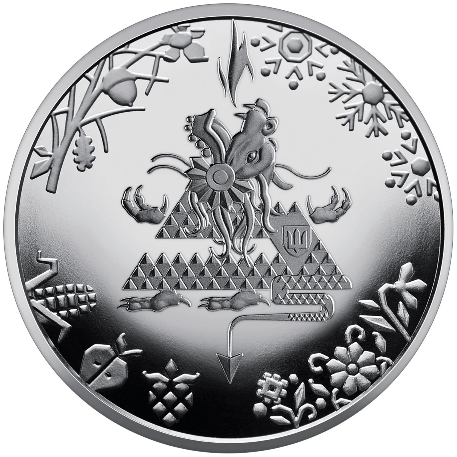 A stylized dragon—symbolizing 2024's male fire element—inside a triangle. To its right is the Ukrainian Armed Forces chevron, representing defenders' courage. Surrounding it are seasonal symbols: snowflakes, flowers, fruits, and branches.