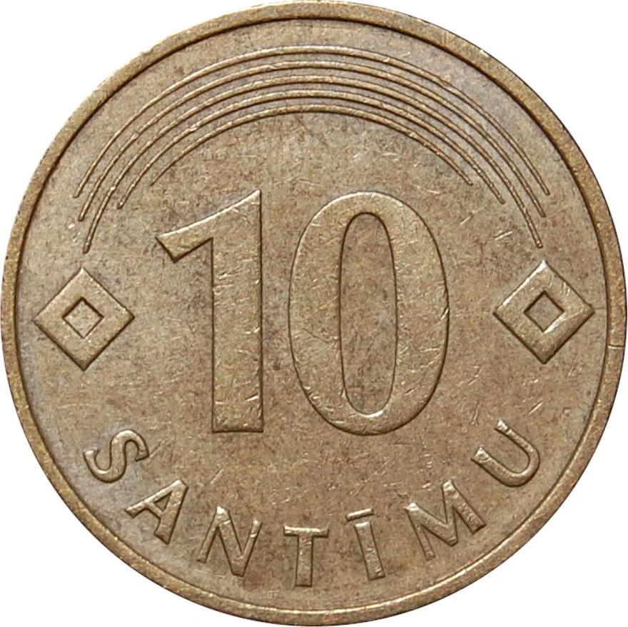 The coin features a central "10" with "SANTĪMU" below. Above the number, five arcs connect two diamond-shaped suns on either side.