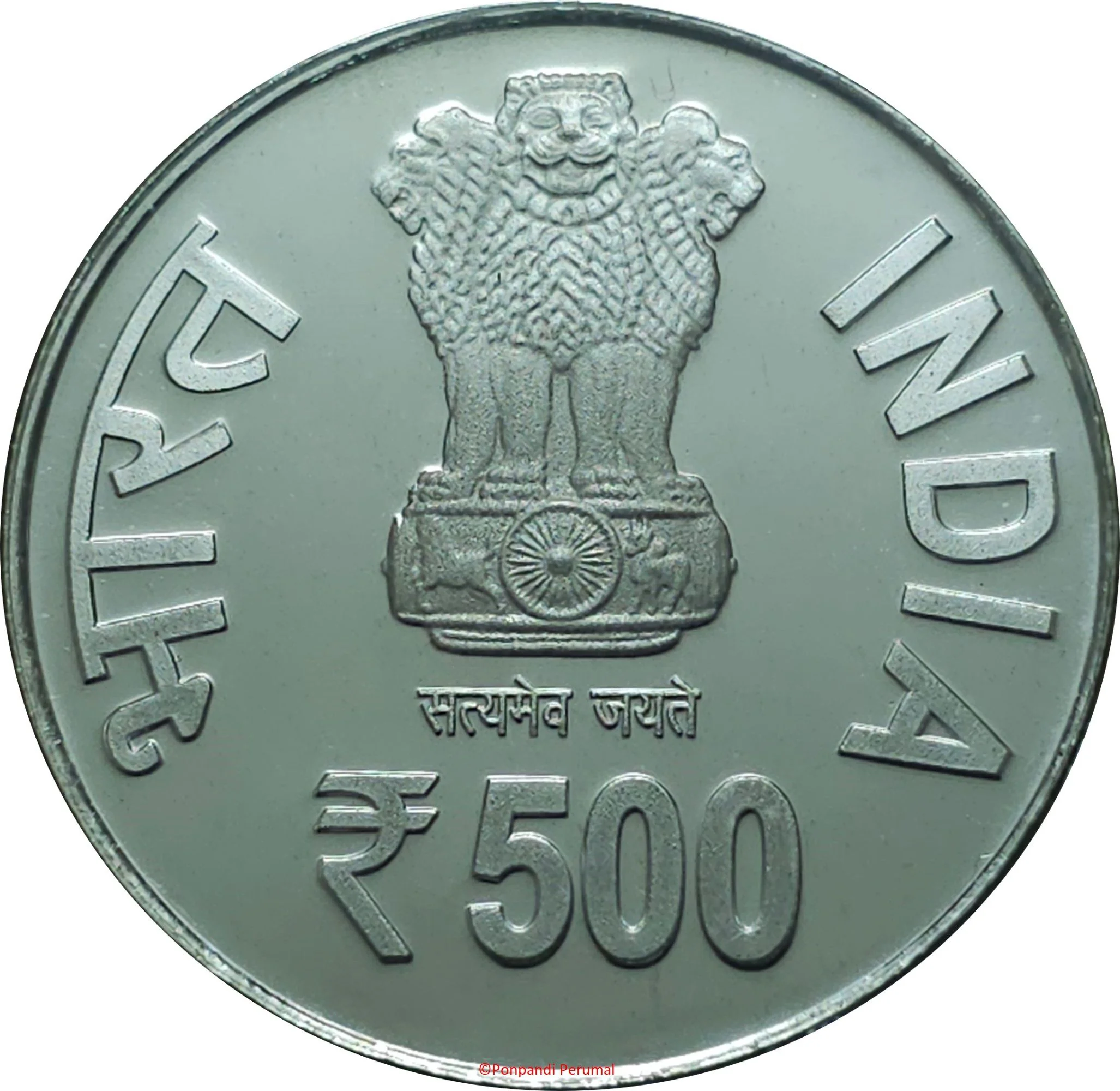 The obverse features the Ashoka Pillar Lion Capital with "सत्यमेव जयते" below, flanked by "भारत" and "INDIA". The Rupee symbol "₹" and denomination "500" are inscribed beneath the capital.