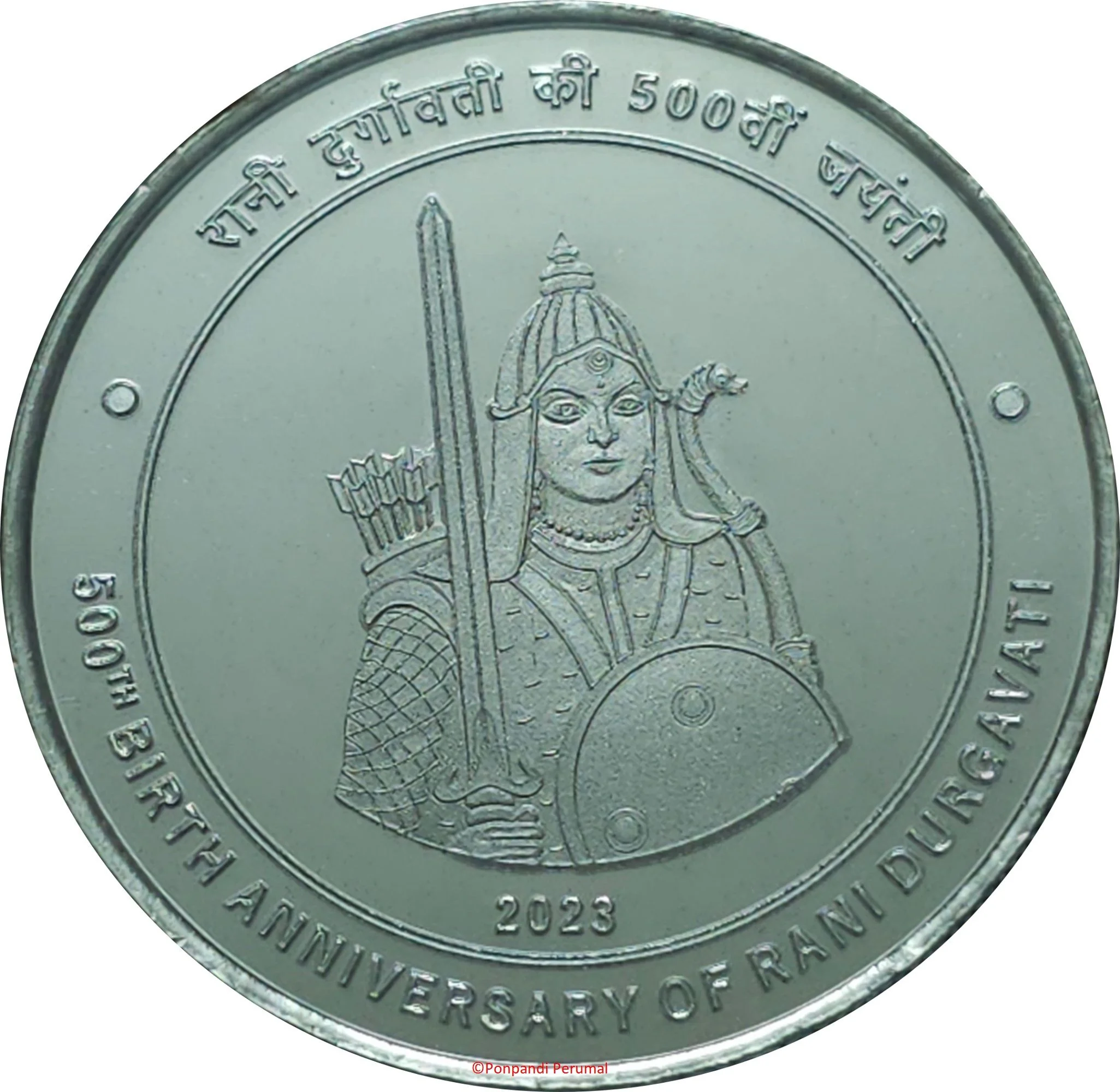 The obverse features a portrait of Rani Durgavati. "रानी दुर्गावती की 500 वीं जयंती" is inscribed on the upper periphery, with "500TH BIRTH ANNIVERSARY OF RANI DURGAVATI" on the lower periphery. The year "2023" is shown below the portrait.