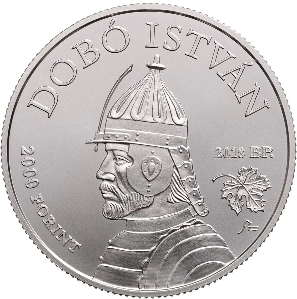 Portrait of István Dobó facing left, with a vine leaf on the right.