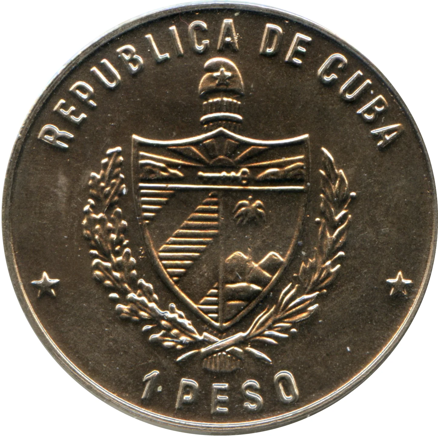 Cuban coat of arms with country name above, face value below, flanked by two five-pointed stars.
