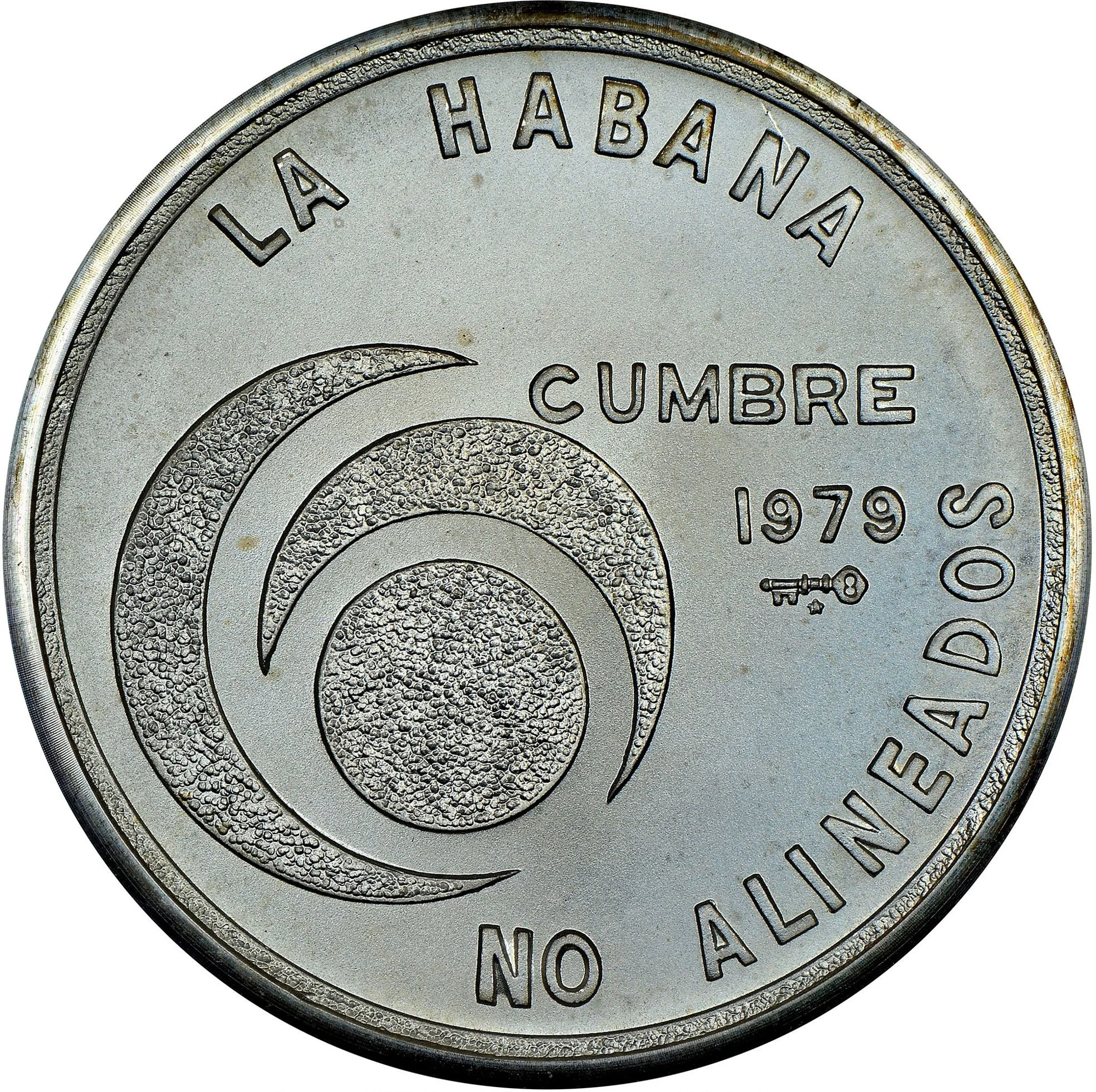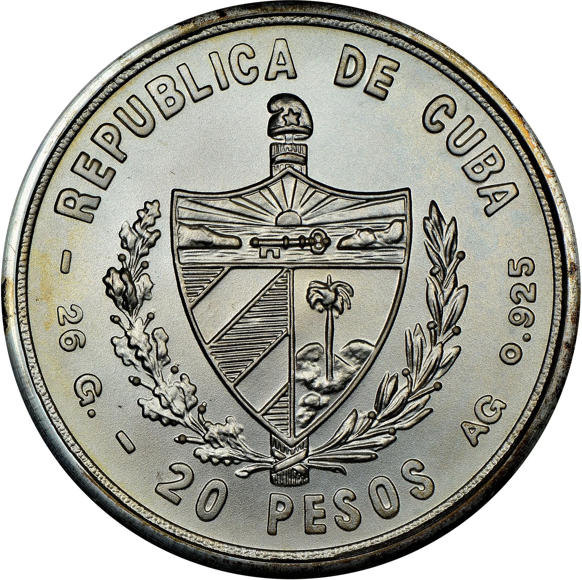 Cuban coat of arms with curved country name above, face value below, and weight and fineness on the sides.
