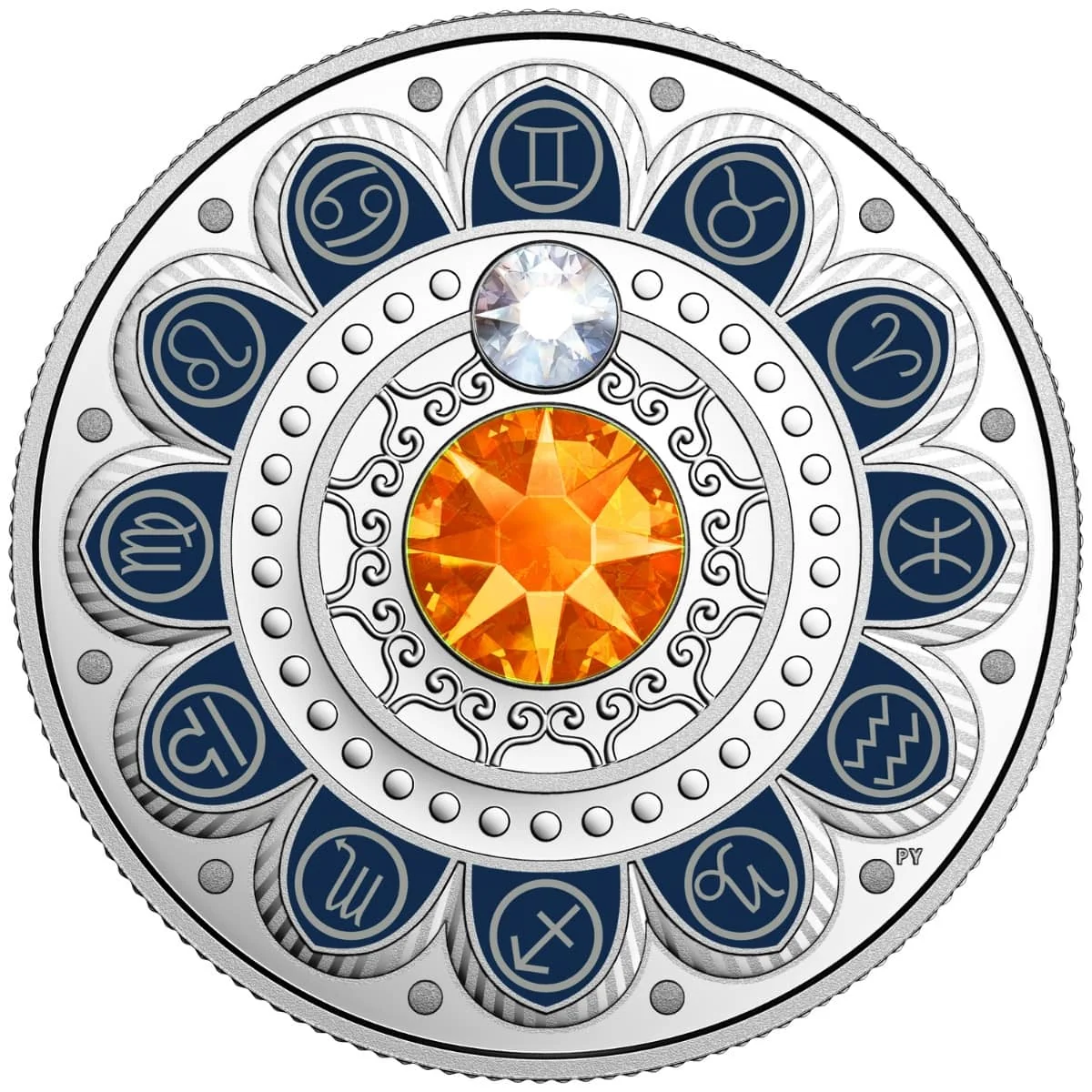 Swarovski crystal aligns with the symbol, orange center matches sign color.