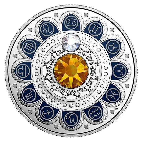 Swarovski crystal matches the sign's symbol, with an amber center reflecting its color.