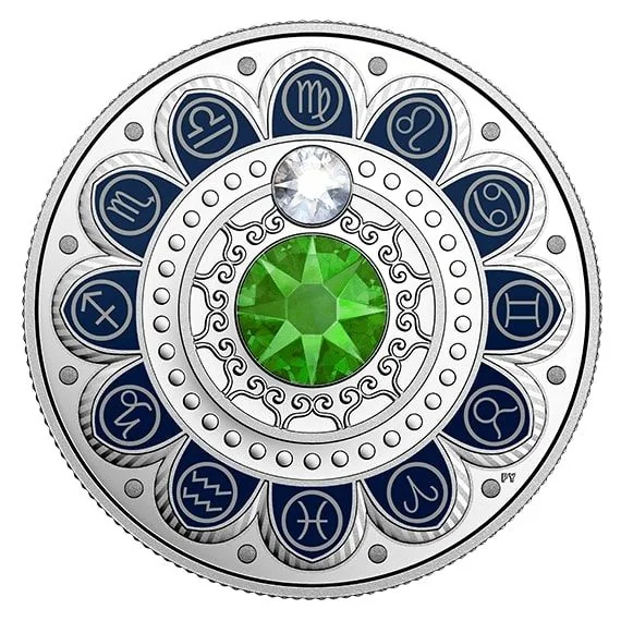 Swarovski crystals form the sign's symbol, with a chartreuse center reflecting its color.