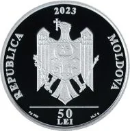 Description: Foreground: Moldova's Coat of Arms. Top: year "2023". Bottom exergue: "Ag 999", "50 LEI", "16,5 g". Below: "REPUBLICA MOLDOVA" in capitals.