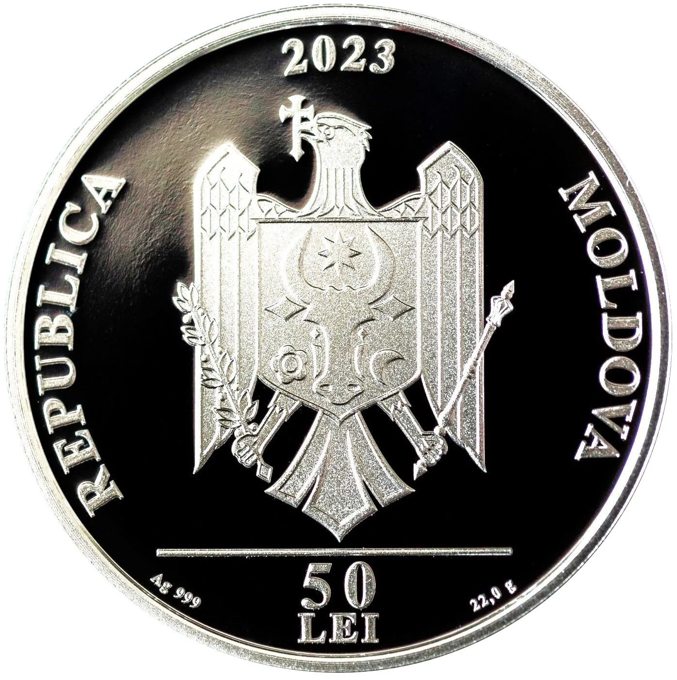 Description: Foreground: Moldova's coat of arms. Top: year "2023". Bottom exergue: "Ag 999", "50 LEI", "22,0 g", and "REPUBLICA MOLDOVA".