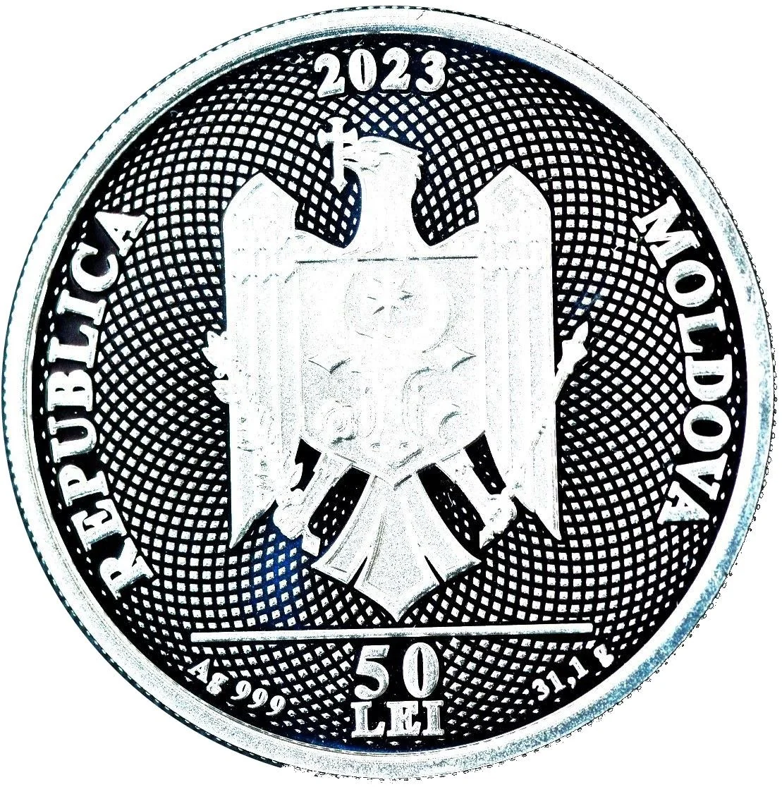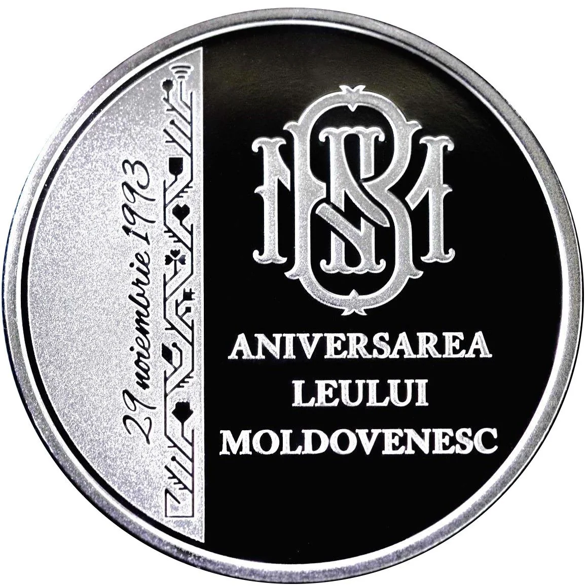 Description: - Foreground: NBM logo, "Tree of Life" ornamental girdle, text "ANIVERSAREA LEULUI MOLDOVENESC", with vertical exergue note "29 noiembrie 1993".