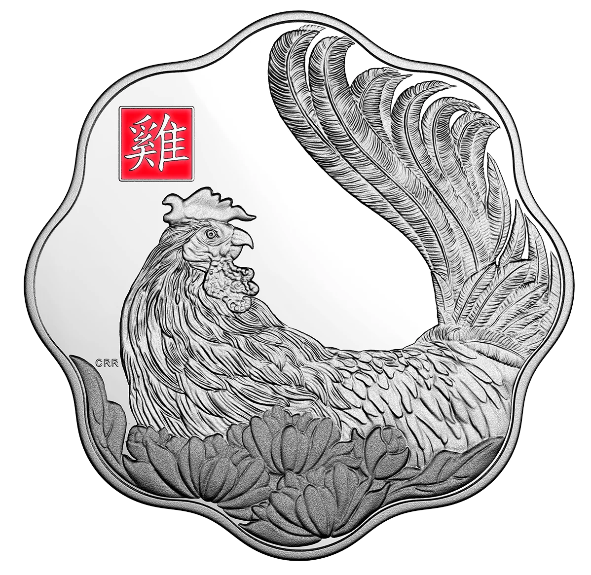Rooster facing right, red enamel box with Chinese character for rooster.