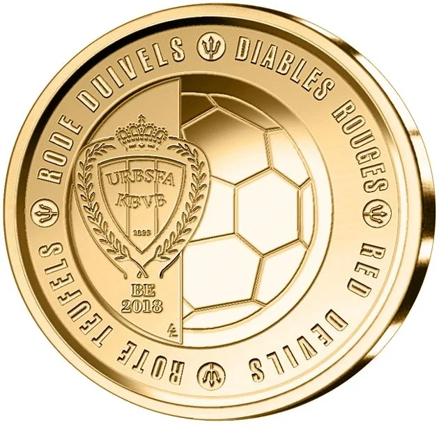 Belgian Football Union sigil on a ball, surrounded by national team names in four languages, separated by trident symbols.