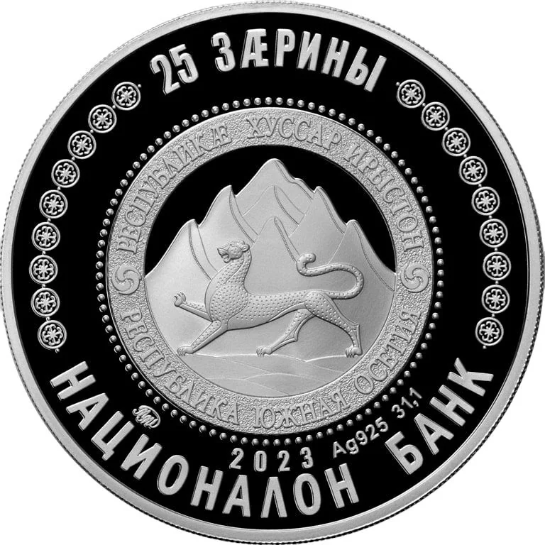 Description: Republic of South Ossetia emblem, value above, mintmark, date, fineness, and weight below.