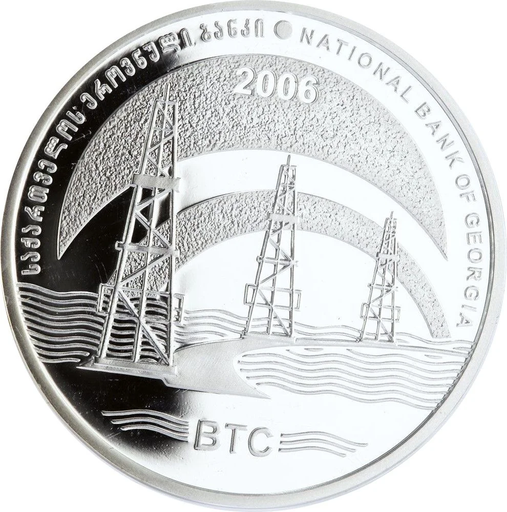 A relief of three Caspian Sea oil wells forms the circular center, with wavy lines for the sea. Mirrored textures create a rising sun, engraved with 2006. The top bears a bilingual legend: "საქართველოს ეროვნული ბანკი / NATIONAL BANK OF GEORGIA". The bottom features the BTC abbreviation and stylized wings.