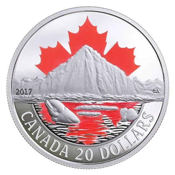 Beluga surfaces among ice floes, a maple leaf sun reflected below.
