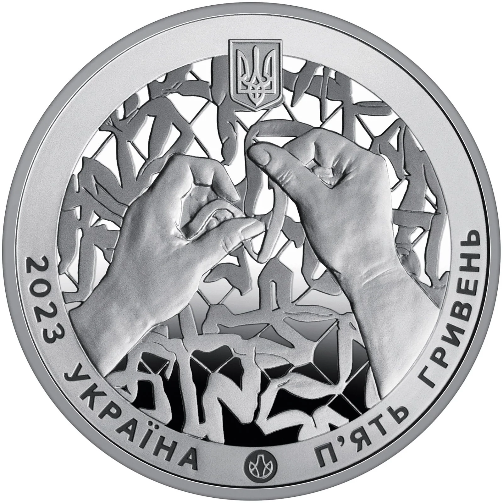 Hands weaving a camouflage net, symbolizing volunteer aid and national unity. Featuring Ukraine's coat of arms, inscriptions "2023," "УКРАЇНА," "П’ЯТЬ ГРИВЕНЬ," and the Mint logo.