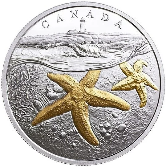Gold-plated starfish pair underwater with coastal lighthouse.