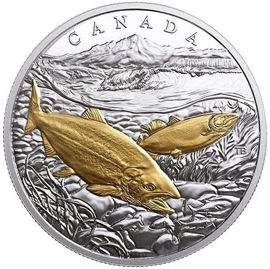 Gold-plated salmon pair underwater with coastal mountains behind.